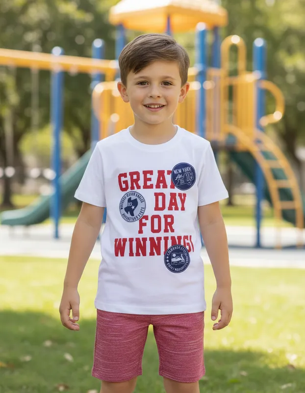 A camiseta em branco traz estampa moderna com frase em destaque e detalhes gráficos, transmitindo um visual atual e cheio de personalidade. A bermuda em tom rosado mesclado complementa o conjunto com conforto e liberdade de movimentos, ideal para acompanhar a rotina das crianças.